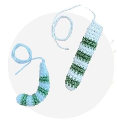 Recheie levemente a cauda até a carreira 18, faça 3 pb adicionais, dobre e feche a cauda com 4 pb. Corte o fio, deixando uma longa ponta de fio para a montagem.