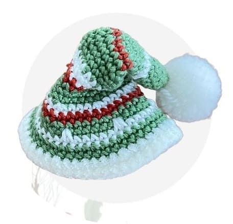 Nota: O chapéu élfico não fica tão bem na cabeça com duas orelhas. Se você quer ter seu gatinho com um chapéu élfico, então você só precisa fazer crochê em uma orelha.