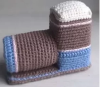 Crochetar uma parte em verde escuro com pb apenas na alça de trás. Corte a linha, deixando uma ponta para costurar. Costure as peças, agarrando a alça frontal para a primeira parte e a alça traseira para a segunda parte. Coloque as bases de papelão dentro, acrescentando um pouco de enchimento entre elas.